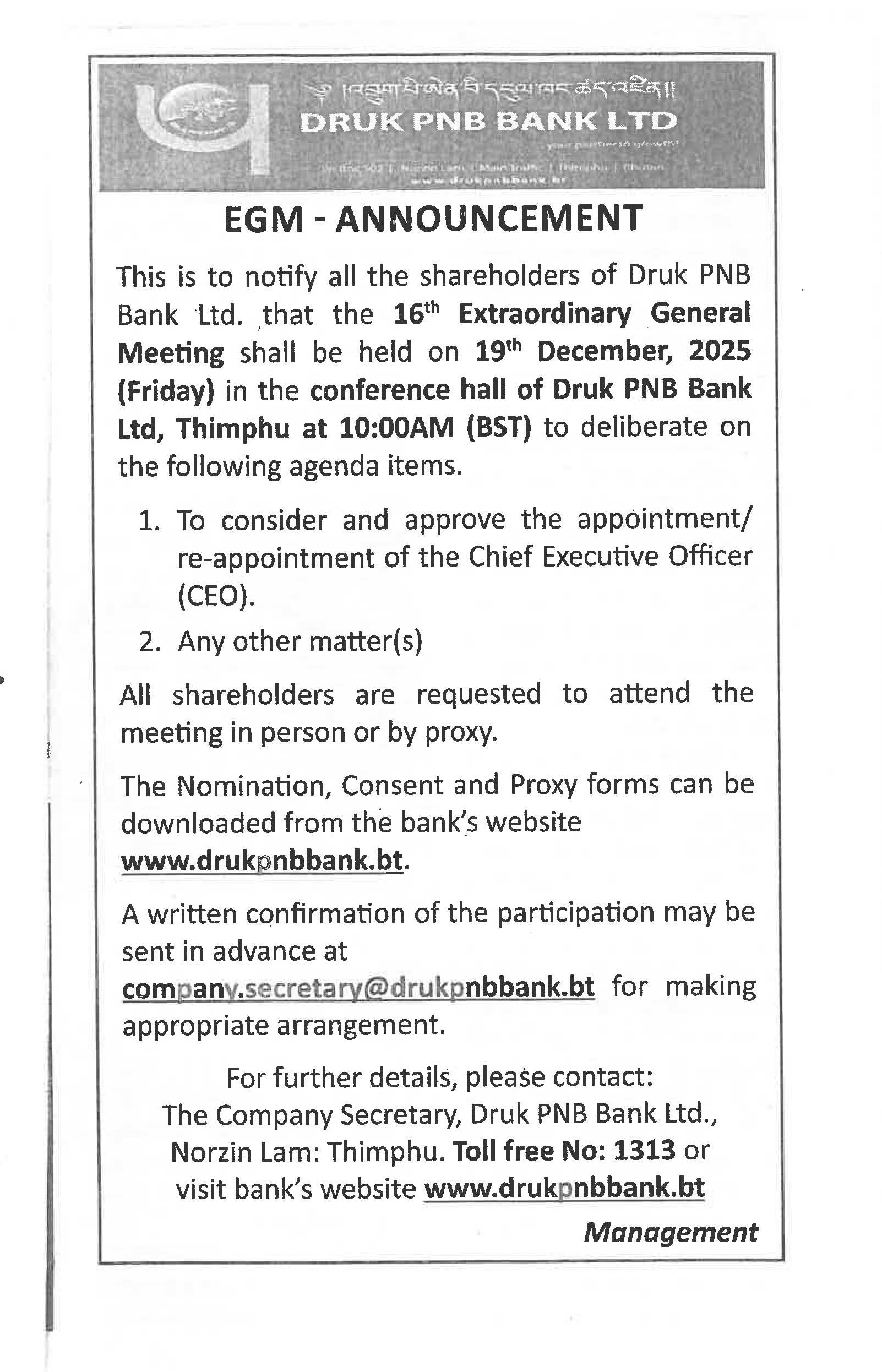 Interested candidates fulfilling the above criteria may submit their DPNBL employment application form along with their academic certificates and transcripts, Medical fitness certificate, copy of valid CID card, Security Clearance Certificate and NOC from their current employer (if employed), latest by 09.06.2025. Preference will be given to candidates with career orientation towards financial institution, good leadership quality and innovativeness, possess problem solving skills. Applicants should have clean credit history with all financial institution (CIB) and with absence of any demerits. DPNBL employment application form(Click here) can be downloaded fromour websitewww.drukpnbbank.bt. Only shortlisted candidates will be called for interview. No applications shall be received through email.