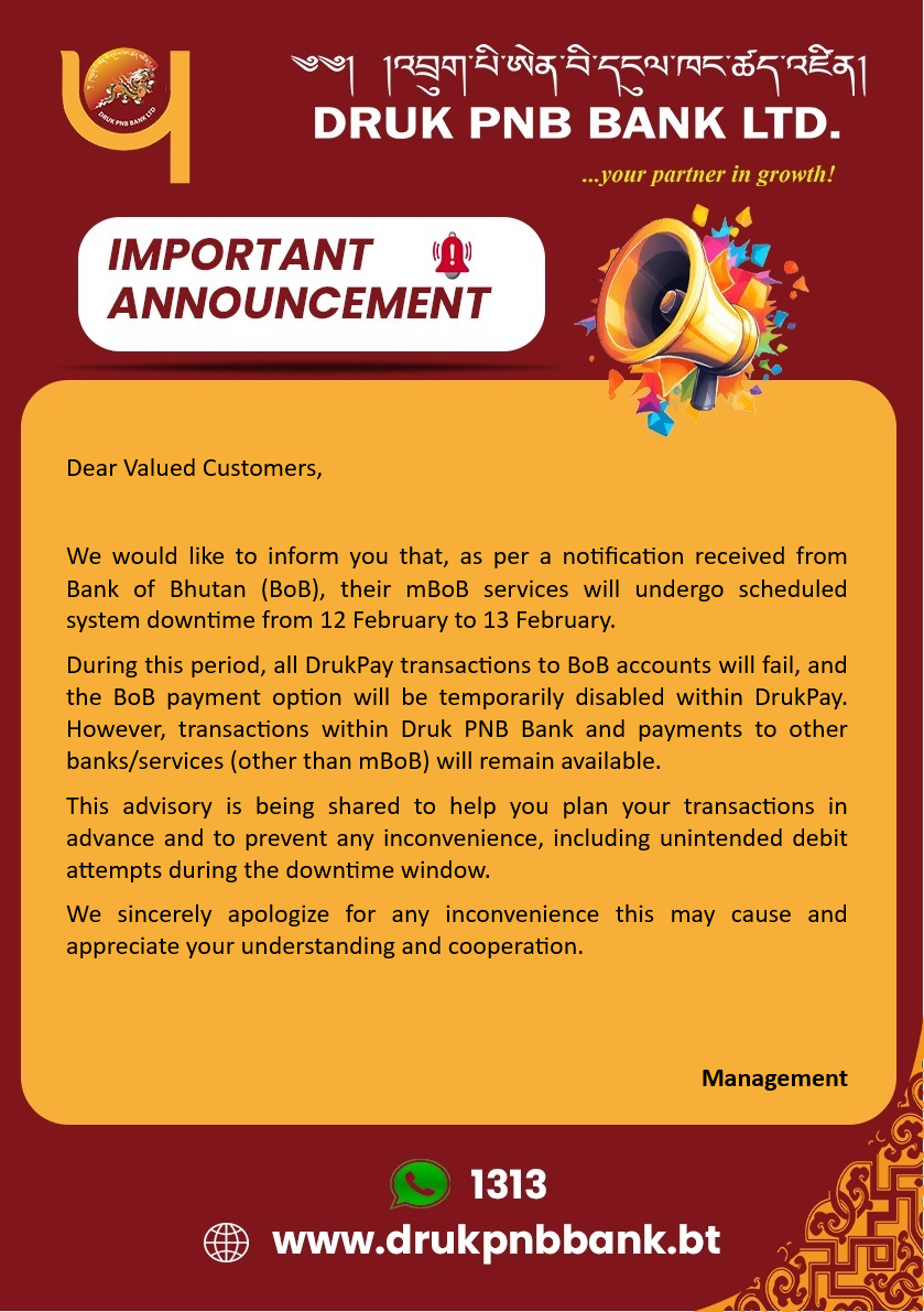 DRUK PNB BANK Ltd would like to thank our valued customers who have updated their KYC information. For those who have not updated their KYC information, we request them to visit our nearest DPNBL Branch offices and update your latest KYC information at the earliest which is mandatory as per AML/CFT Act 2018 and RMA, AML/CFT rules & regulation 2022, chapter 6.